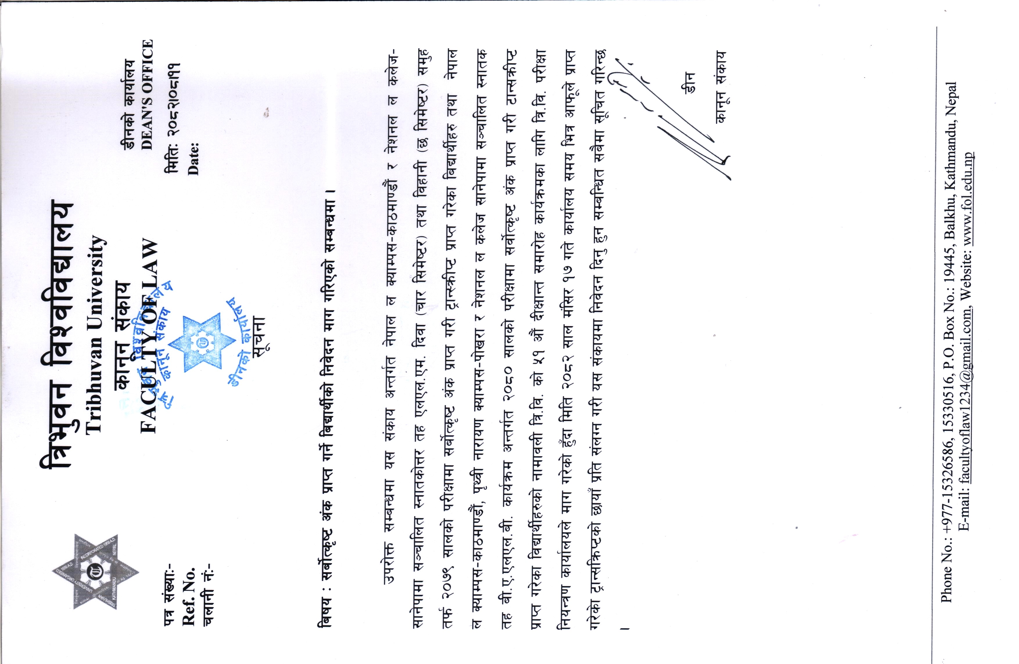 सर्वोत्कृष्ट अंक प्राप्त गर्ने विद्यार्थीको निवेदन माग गरिएको सम्बन्धमा ।