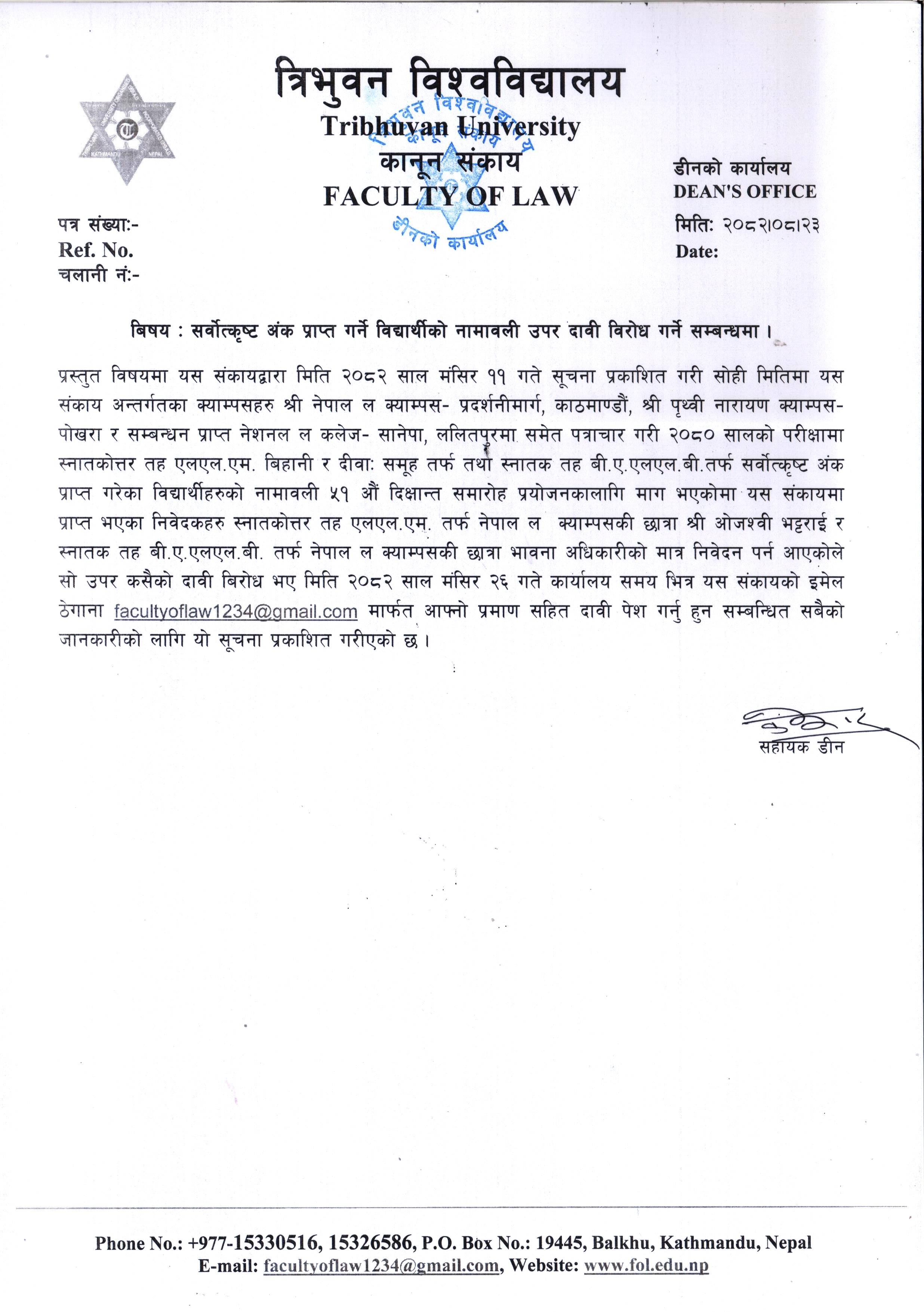 सर्वोत्कृष्ट अंक प्राप्त गर्ने विद्यार्थीको नामावली उपर दावी विरोध गर्ने सम्बन्धमा ।