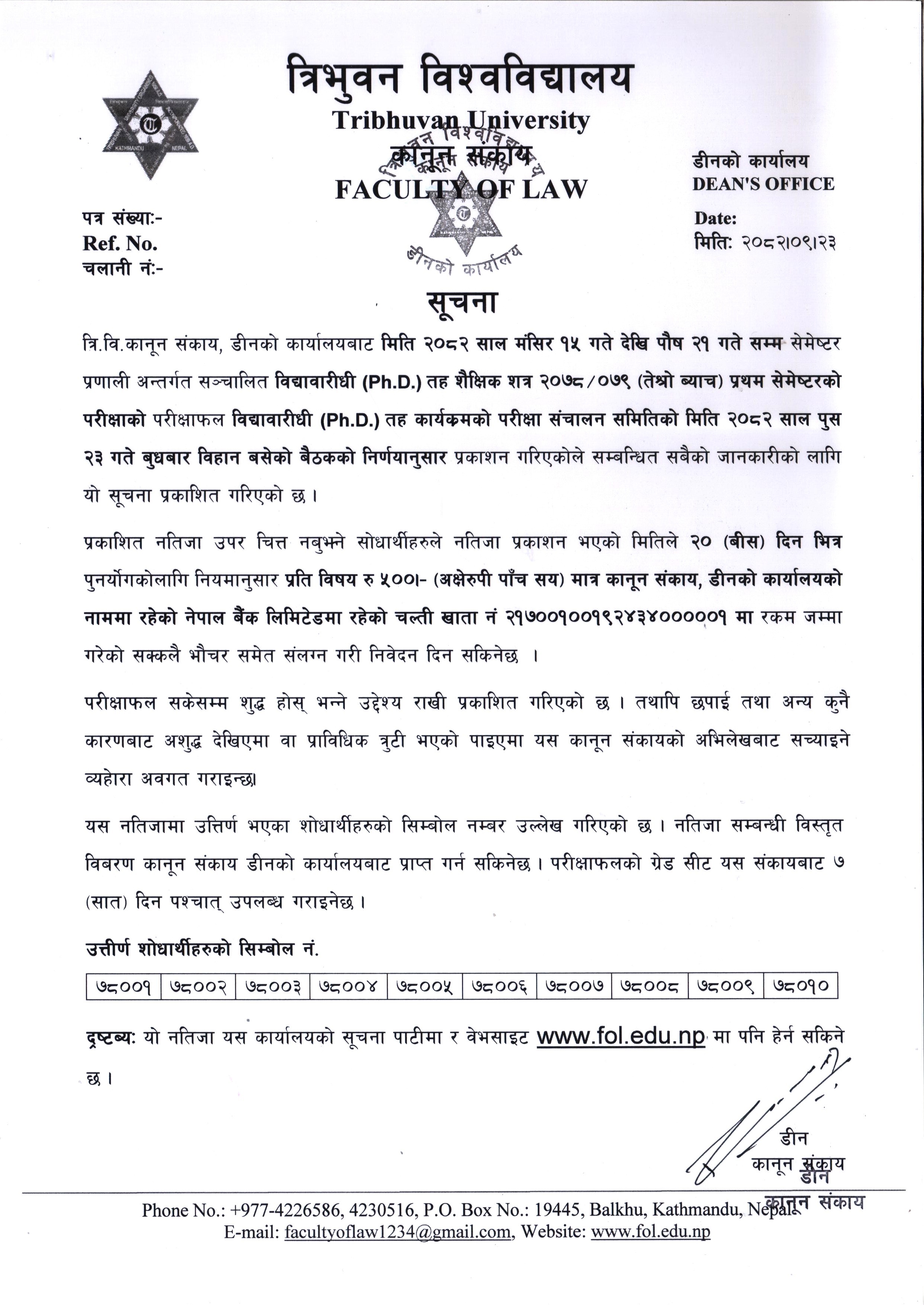 विद्यावारिधि तह शैक्षिक सत्र २०७८।७९ (3rd Batch) प्रथम सिमेष्टरको नतिजा प्रकाशित गरिएको सम्बन्धी सूचना