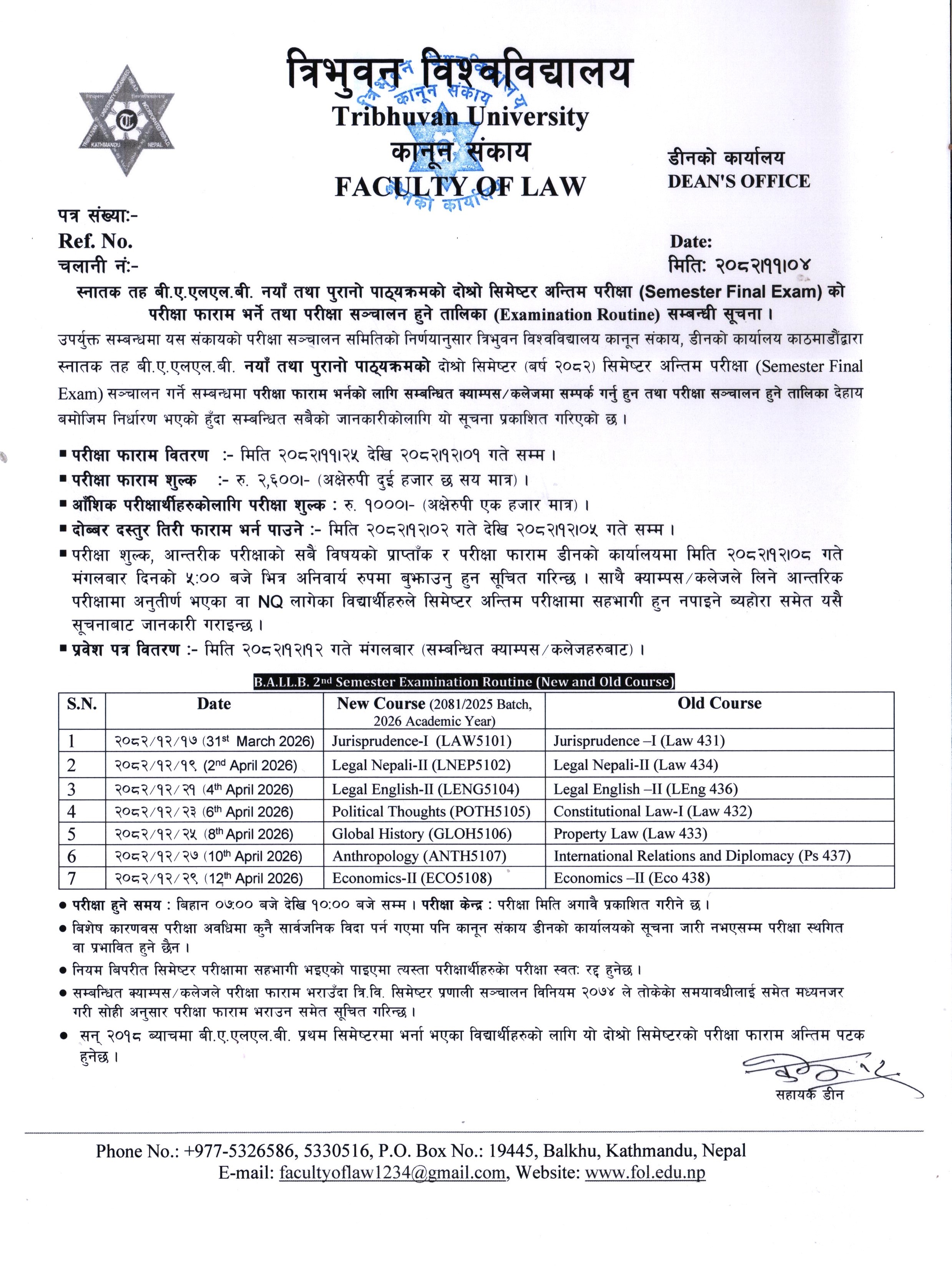 Routine of BALLB 2nd Sem 2025 Batch 2026 A.Y.