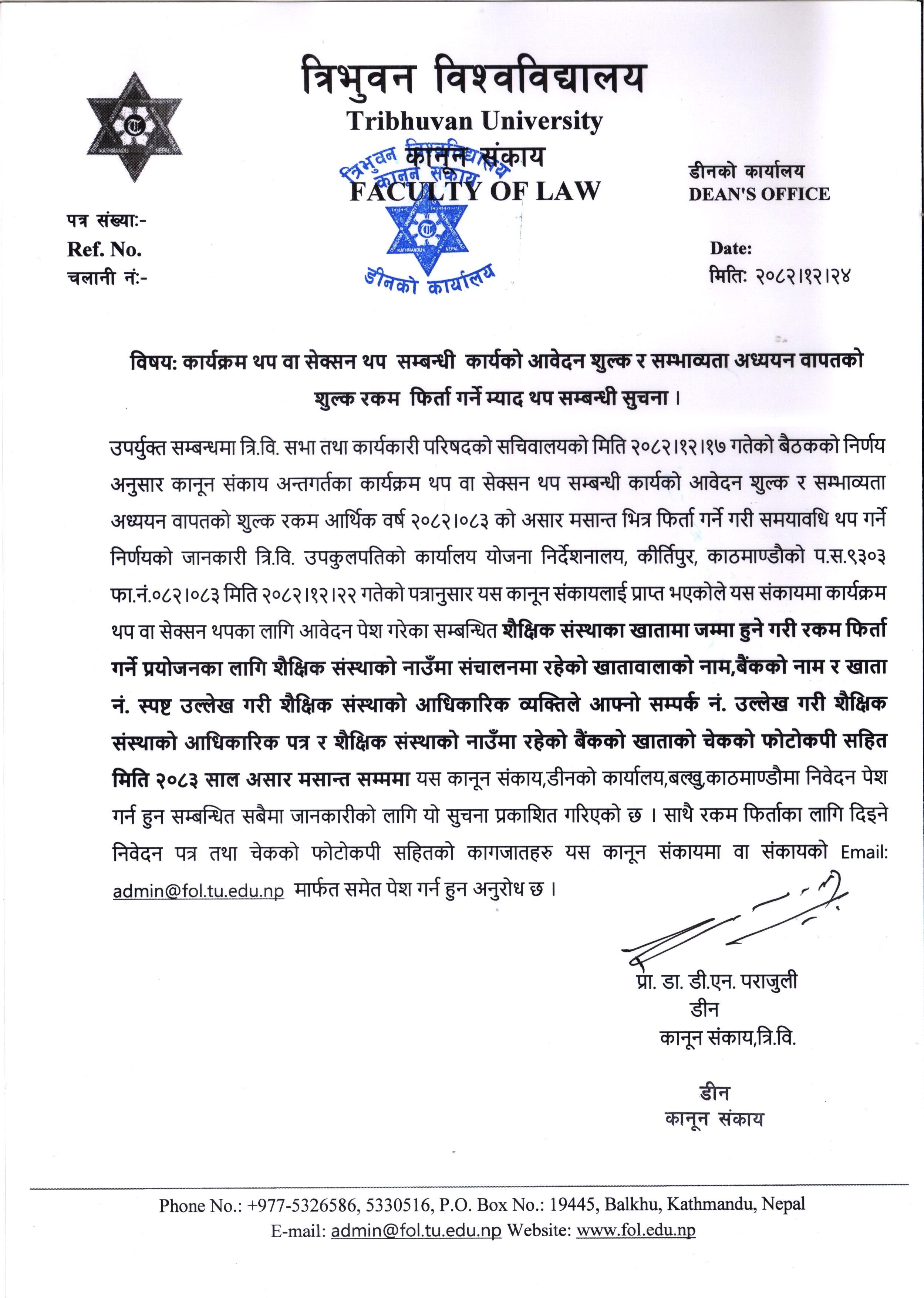 Notice regarding ONLINE Entrance Examination Application Form Call of 3 Years LL.B. 2082/83