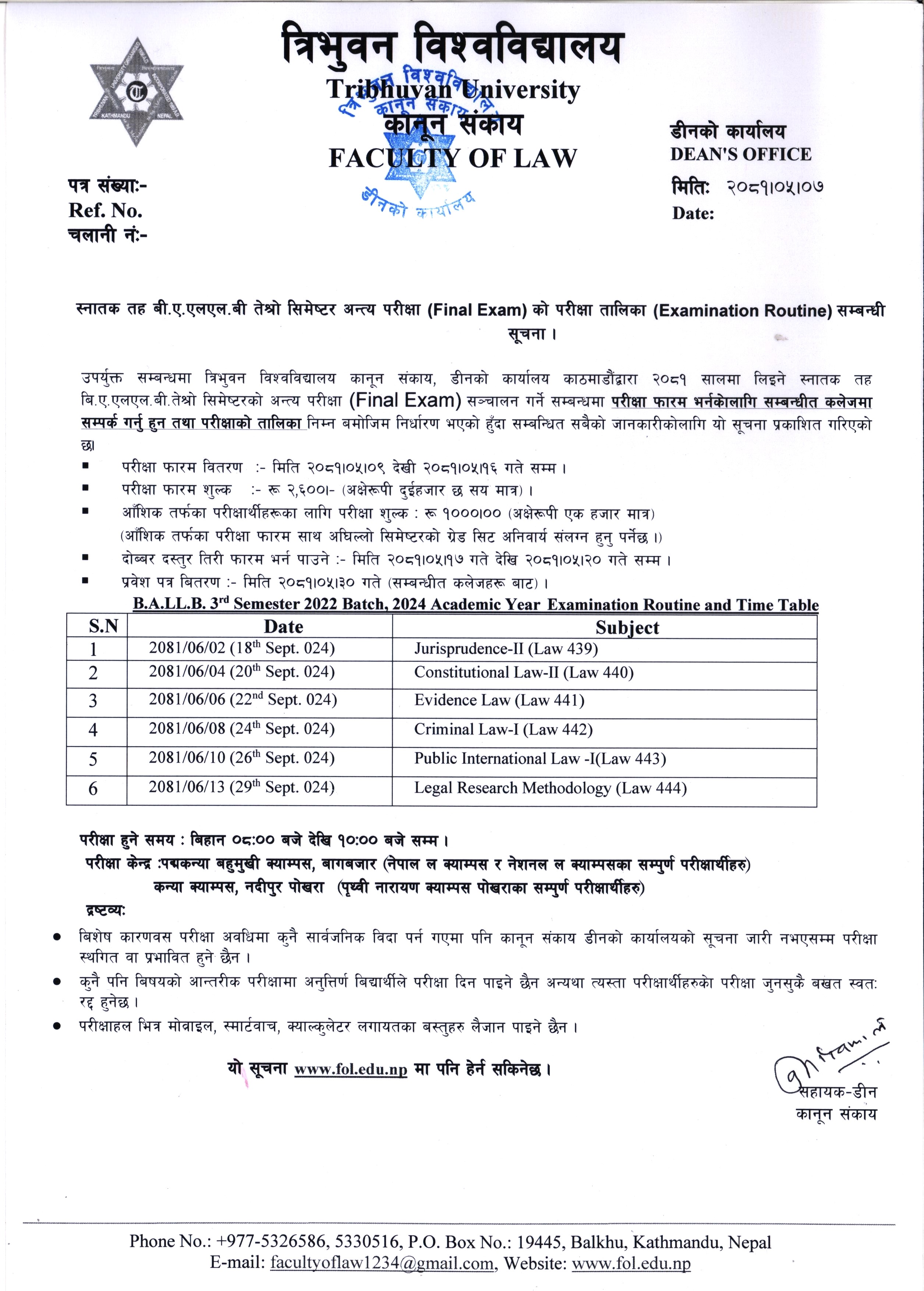 BALLB 3rd Semester 2078 (2022 Batch) and A.Y. 2024