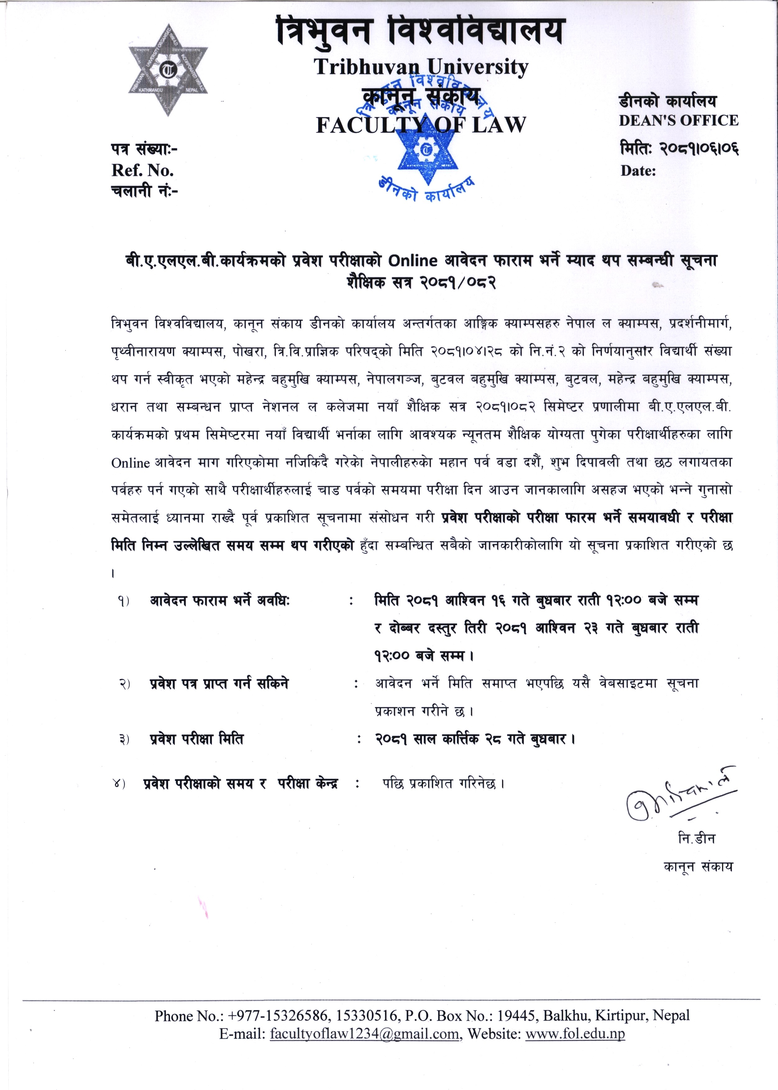 TIME EXTENSION Notification to call the ONLINE ENTRANCE APPLICATION FORM for the Admission of the Students in BALLB Programme 2081/082