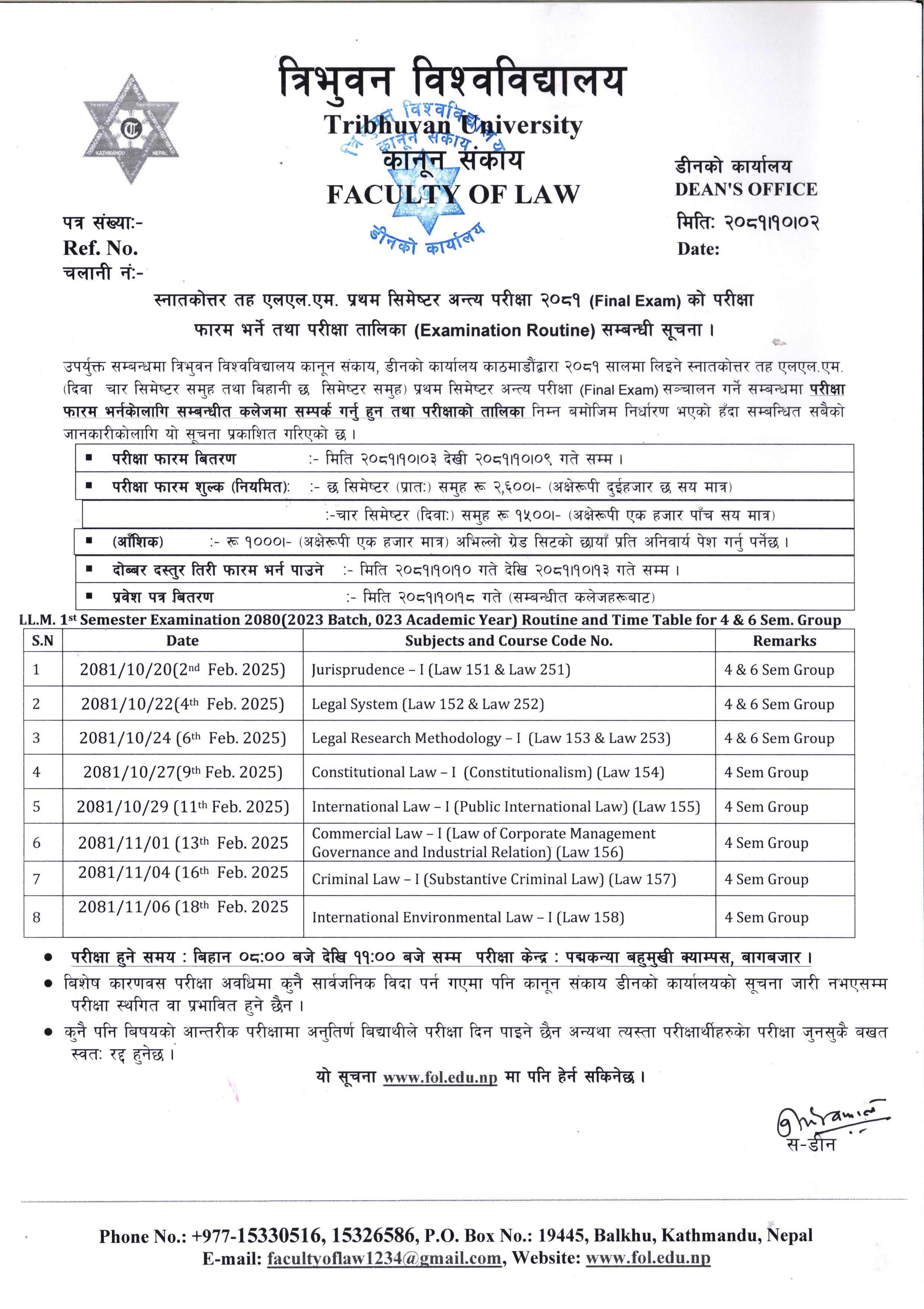 Notice regarding LL.M. 1st Semester 2080 (2023) Batch and Academic Year 2023 Exam Form Fill up, Routine, Time-Table and Others