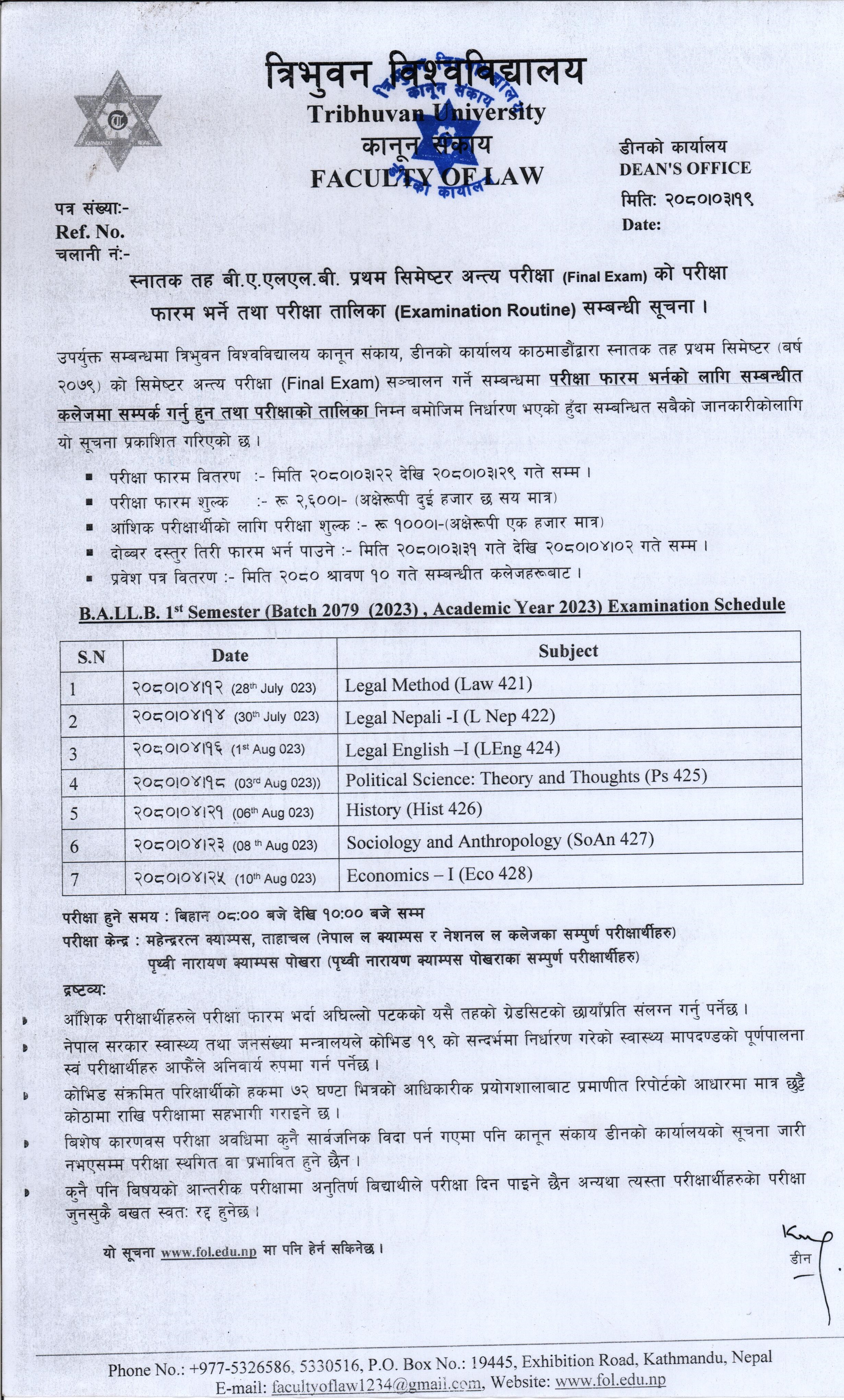 Notice regarding B.A.LL.B 1st Semester 2079 (2023) Batch and Aademic Year 2023 Exam Form Fill up, Routine, Time-Table and Others
