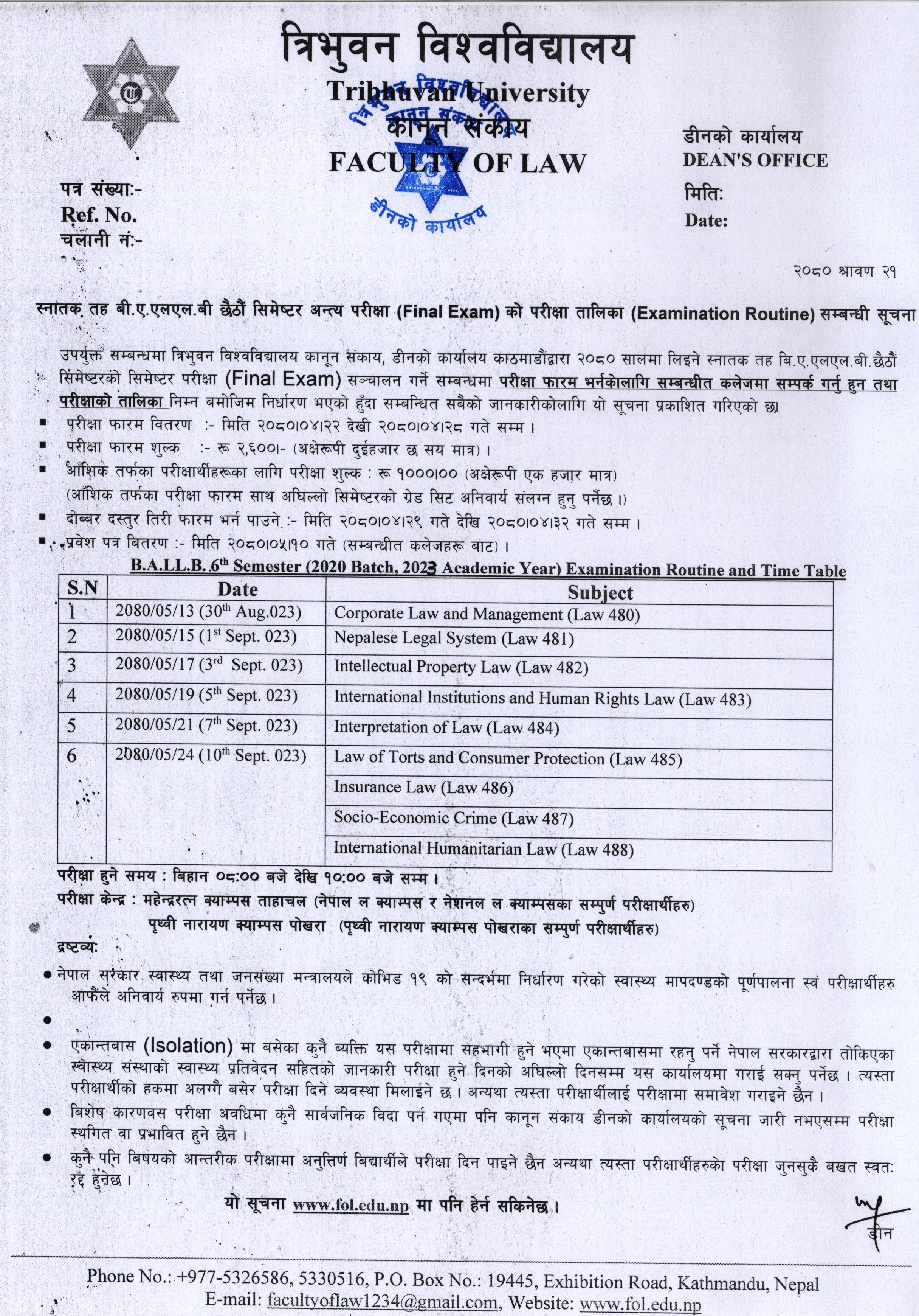 Routine of BALLB 6th Semester 2076 (2020 Batch) and Academic Year 2023